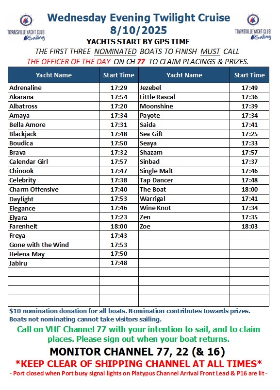 Skippers of boats nominating can view their starting times here - > TWILIGHT SAILING START TIMES - WEDNESDAY 8TH OCTOBER 2025
