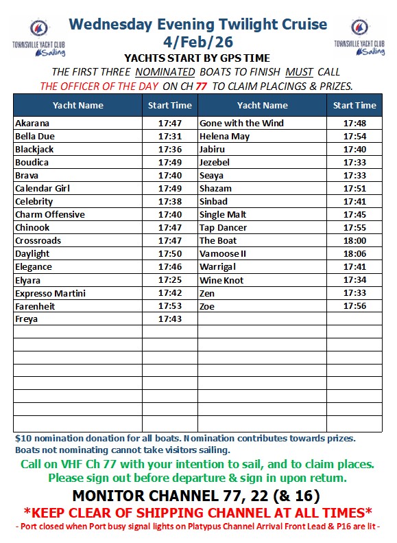 Skippers of boats nominating can view their starting times here - > TWILIGHT SAILING START TIMES - WEDNESDAY 4TH FEBRUARY 2026