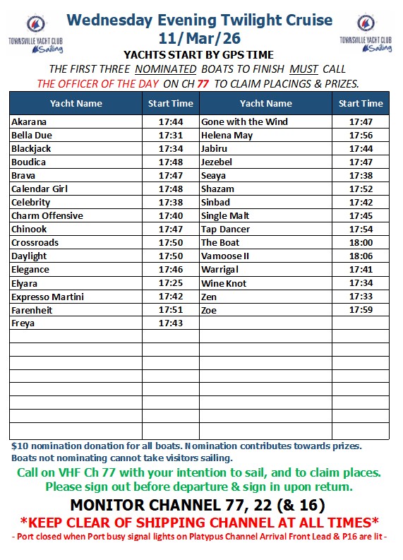 Skippers of boats nominating can view their starting times here - > TWILIGHT SAILING START TIMES - WEDNESDAY 11 MARCH 2026